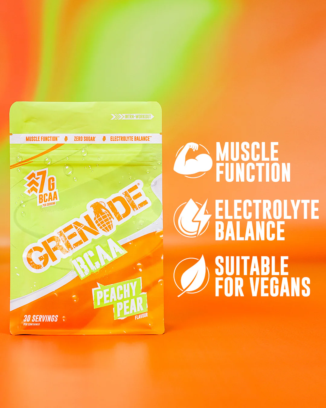 In this reformulated Intra workout we’ve made sure it’s easy for you to reap the BCAA benefits by creating a mouthwatering Peachy Pear flavour.