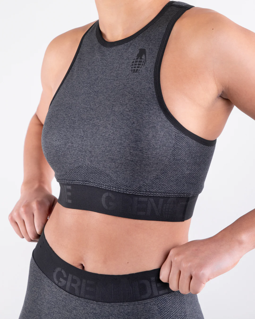 Available in a sleek Charcoal Grey colour, the Seamless Crop Top pairs perfectly with the Seamless Leggings, also available in Charcoal Grey. Both feature a discreet printed Grenade logo on the right chest and stamped branding around the under/waist band.